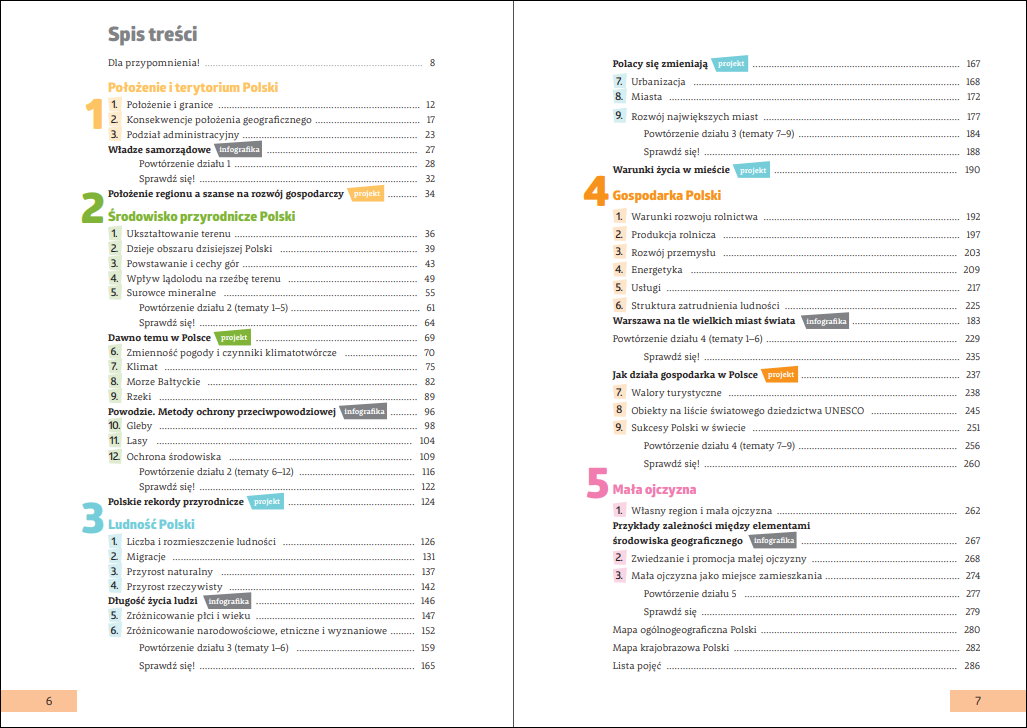Uważny czytelnik znający dobrze podstawę programową obowiązującą w klasie siódmej przynajmniej do 2029 roku zwróci na pewno uwagę na pewne modyfikacje w zakresie układu treści, które należy ocenić jako korzystne z punktu widzenia ucznia. Choć również w podstawie programowej zaproponowano 5 działów do realizacji, to jednak w innym podziale. Autorzy proponują nam „wykrojenie” krótkiego działu wprowadzającego do całej klasy siódmej, gdzie szybko wprowadzają elementy położenia Polski i ich konsekwencje czy podział administracyjny kraju. Następie znajdziemy rozdział poświęcony geografii fizycznej Polski, ale z propozycją ujęcia go w ramach dwóch sprawdzianów. Również elementy geografii społeczno-ekonomicznej Polski podzielone zostały na dwa duże odrębne działy, z kolei własny region i mała ojczyzna – scalone w jeden dział. Ten zabieg jest zresztą zupełnie rozsądny, z uwagi na dublowanie się tych wątków w podstawie programowej. Dość ciekawym zabiegiem jest z kolei faktyczna rezygnacja z odrębnego rozdziału dotyczącego problemów środowiska geograficznego Polski i zamiast tego rozproszenie jego treści między inne działy oraz przedstawienie części jego zagadnień jako infografik, a także w formie uzupełniającej – do realizacji metodą projektu. Taki sposób rozstrzygnięcia jest jak najbardziej dopuszczalny, jest rozwiązaniem nowym i ciekawym, może zresztą zyskać uznanie z powodu omawiania wskazanych przez Ministerstwo wybranych problemów środowiska geograficznego adekwatnie do innych realizowanych treści, co będzie te wątki czyniło lepiej umiejscowionymi w analizowanej rzeczywistości przedmiotowej.