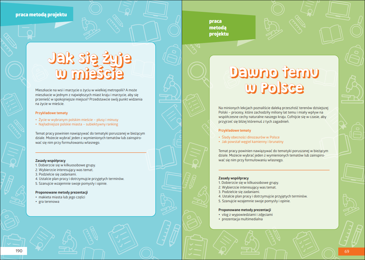 Choć zmiany w podstawie programowej dla klasy siódmej wejdą w życie dopiero za kilka lat to autorzy podręcznika najwyraźniej postanowili z własnej inicjatywy zaproponować wdrożenie – jako proponowany element – aktywizujących metod pracy w swoim utworze. W konsekwencji otrzymujemy propozycję realizacji sześciu projektów – dotyczą faktycznie wszystkich „działów” z ministerialnej wersji podstawy programowej. Do ich realizacji zaproponowano także wybrane formy prezentacji. Kiedy po raz pierwszy zauważyłem to w podręczniku GWO byłem bardzo pozytywnie zaskoczony takim podejściem. I choć to na nauczycielu szkolnym ciążyć będzie nauczenie młodzieży pracy tą metodą, to zaproponowane zagadnienia są przystępne, a proponowane realizacje – jedynie umiarkowanie trudne. Projekty można realizować jako zadania dodatkowe na ocenę, w formie konkursów, albo jako część szkolnego tygodnia projektowego.