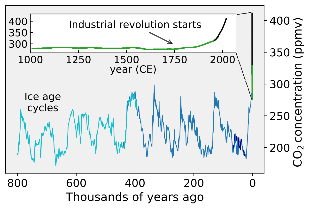 Źródło: Femke Nijsse; https://en.wikipedia.org/wiki/Climate_change#/media/File:Carbon_Dioxide_800kyr.svg