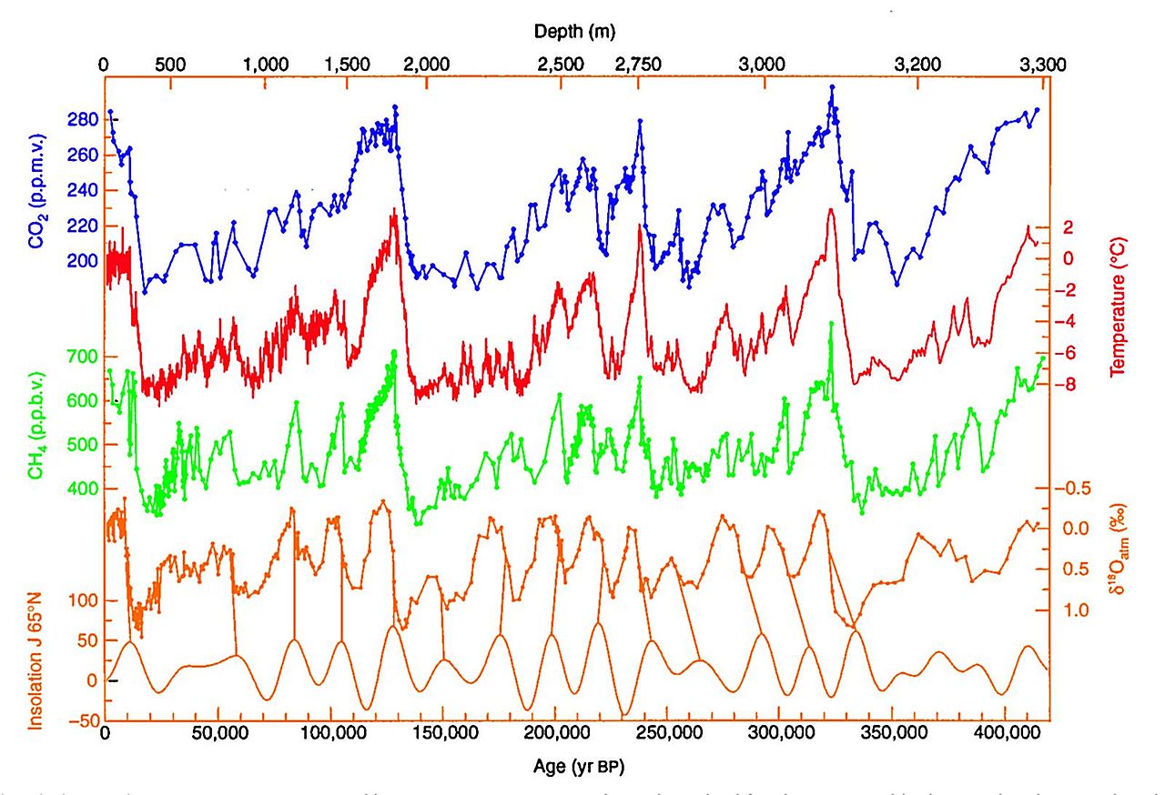 Cykle Milankovicia (pomarańczowe – dostarczana energia słoneczna) pokrywają się z notowanymi wartościami w rdzeniach lodowych (CO2 – niebieskie, metan – zielone, szacowane ochylenuia temperatury powierza – czerwone) na rosyjskiej stacji Wostok na Antarktydzie