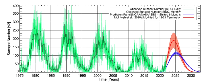 Aktywność Słoneczna (liczba odnotowanych plam na Słońcu) w cyklach 11-letnich (prognozowany obecny – 25 cykl – słaby: niebieski lub silniejszy: czerwony) nie pokrywa się z postępującym wzrostem globalnej temperatury powietrza