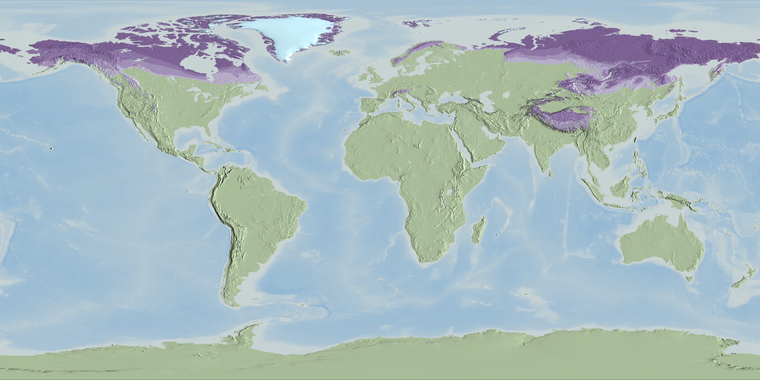 Obszar na Ziemi objęty wieczną zmarzliną, ciągłą, nieciągłą i izolowaną (kliknij, aby powiększyć)