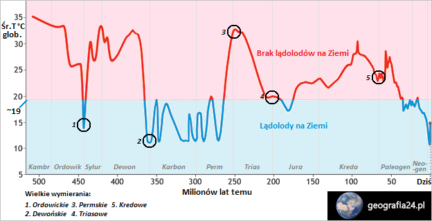 Szacunkowa globalna temperatura powietrza w wybranych okresach geologicznych z termiczną granicą istnienia lądolodów oraz zaznaczonymi 5 wielkimi wymieraniami