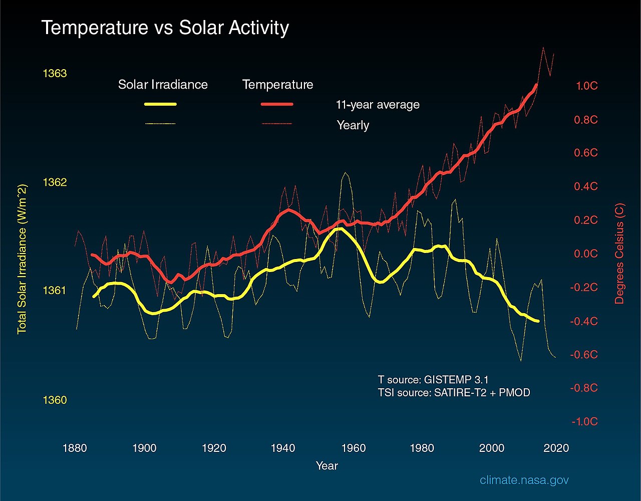 Aktywność słoneczna (żółty) a zmiana globalnej temperatura powietrza (czerwont) w latach 1880-2020 – brak korelacji od 1980 r.