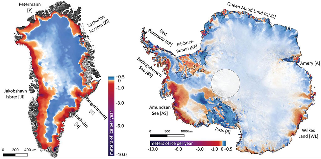 Porównanie zmiany grubości lądolodów na Grenlandii i na Antarktydzie w latach 2003-2019 – wyraźny ubytek (kolor czerwony) po kilka metrów rocznie na Grenlandii, sytuacja na Antarktydzie bardziej zróżnicowana